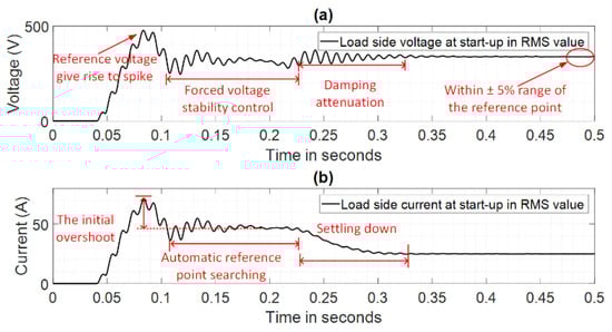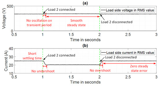 Figure 11 implies the system voltage–current response. Steady-state switchover becomes smoother after the initial start-up. In the voltage control loop, voltage is regulated at 415 V nominal voltage, with slightly deviations for V-P control tuning. In the first second, loads 1 and 2 are both connected, requiring 25 kW active power. At 1 s, load 2 is disconnected, so that the load demand is decreased to only 20 kW. As the voltage is kept at a fixed value, the decoupled current regulation in d-q frame tracks the new current reference calculated by the new active power reference. Thus, the load current decreases from 1 to 2 s. From 2 s, load 2 is reconnected, so that the reference active power and reference current increase at the same time to satisfy the two loads.