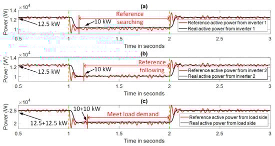 For a fixed coefficient , we switch load 2 off at 1 s and on at 2 s. The results in Figure 12 and Figure 13 show satisfying tracking and response performance. Figure 12 is the multiplication form with a certain adjustment factor from Figure 11, because it is the active power from the generation side. The red line is the reference active power calculated by the V-P control algorithm; the black line is the actual active power from the generation side. Figure 12c is the total active power, which is 25 kW with both loads connected at 0–1 and 2–3 s, and becomes 20 kW with load 1 connected at 1–2 s. Power generator 1 and 2 have equal power sharing between each other, sharing half of the total active power demand. Therefore, (a) and (b) represent generator 1 and generator 2, respectively. Both of them track 12.5 kW well before 1 s and after 2 s, and track 10 kW between 1 and 2 s. This power change is caused by load switches on and off.