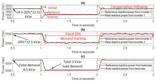 The last plot in Figure 13 shows the ideal numerical reactive power reference and its proper tracking. It is clear that two inverters are unbalanced reactive power provider, where the ratio depends on . This is usually selected at around 0–40%. In Figure 13, is chosen to be 20%. That is, if the total reactive power demand is 4.5 kVar at 0–1 s, power generator 2 provides 20% ∗ 12.5 kVar = 2.5 kVar, and power generator 1 tracks the remaining 4.5 – 2.5 = 2 kVar. At 1–2 s, the reactive power demand required by load 2 only is 3 kVar, power generator 2 gives 20% ∗ 10 kVar = 2 kVar, and power generator 1 follows the remaining 1 kVar. In a later section, the influence caused by variation is discussed. The total reactive power tracking is constant, and changes the ratio of reactive power provided by power supply 1 to 2. This particular power tracking result is unique to this V-P control method.