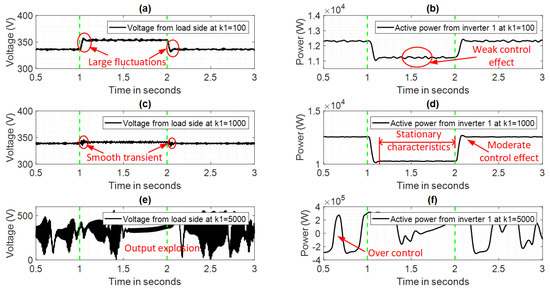 varying result. (a) Measured voltage in inverter 1 when , (b) measured active power in inverter 1 when , (c) measured voltage in inverter 1 when , (d) measured active power in inverter 1 when , (e) measured voltage in inverter 1 when , (f) measured active power in inverter 1 when .