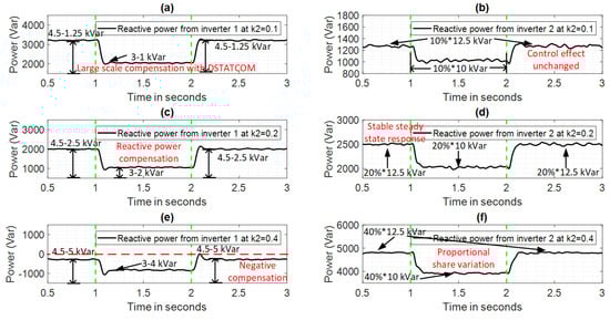 The results for increasing are compared in Figure 15. is fixed at 500. is the proportion of reactive power in measured active power. The total reactive power satisfies load demand, while reactive power in the second source tracks the percentage reference referentially and that in the first source fills the rest. increases by 10%, 20%, and 40%, leading to more dramatic weight on the second source, causing the first source to compensate less. The sum of the active power in two inverters remains unchanged.