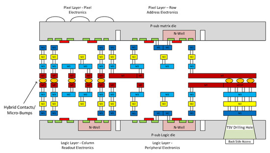 There are other forms of silicon dies interconnections, such as the Through Silicon Vias (TSVs) [8], which are usually placed across the chip IO Ring, as suggested by Seiji Takahashi et al. [9], or at the silicon peripheral area [6,10], which is normally reserved for the readout circuits, as well as for the remaining components of the chip surrounding electronics.