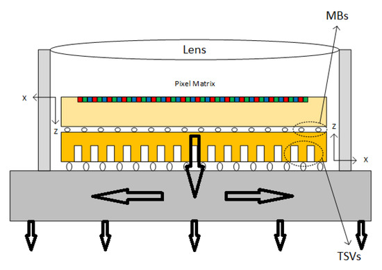 The top silicon tier drawn in Figure 2’s scheme is upside down (containing BSI pixels—just for the current example—and usually contains the addressing circuit drivers) relative to the bottom silicon piece (containing all the readout electronics, including the ADCs and all the remaining power electronics as well). The majority of the CIS heat dissipation occurs at the logic layer, and it is preferable for the thermal conduction to occur downwards respective to the logic layer. In other words, towards the external world through a heat sink, or through—the ceramic package, or through another type of thermal sink, as indicated by Remi Bonnard [7], given that the largest portion of the power consumption is, for obvious reasons, generated in the bottom silicon tier, i.e., the logic layer. Figure 3 depicts the simplified view of a hypothetical vertical stacked image system, with two optical electronic silicon tiers properly assembled, and shows how the heat conduction should occur, towards the underneath holding heat sink piece.
