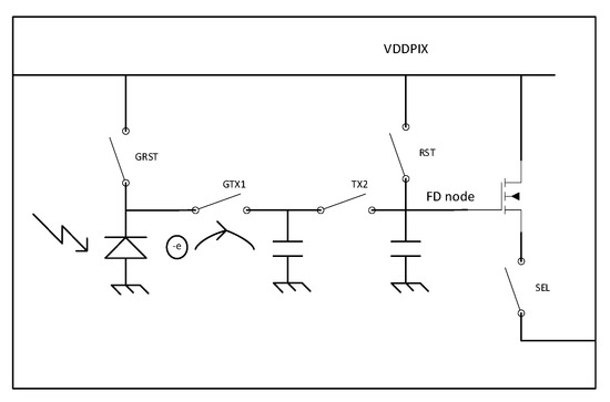 From the author’s perspective, the best pixel structure candidate to consider (in future 3D-stacked CIS developments) is the one used by Konstantinos Moutafis [13], or a more compact GS pixel version, such as the GS 6T pinned-pixel that was indicated by Marius Lunder Lillestol [14], or the solution that was used by Xiaoliang Ge [15], which is based on improvements on the classical low-noise 6T pinned-pixel, thus obtaining an improved GS 7T pinned-pixel. The underlying idea of a low-noise 6T GS pixel is shown below in Figure 5.