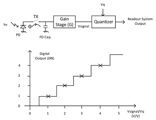 For a clear understanding of how the pixel CG plays an important role (apart from the proper choice of readout circuits and ADC resolution), the problem can be tackled in the following way, as addressed by Seitz et al. [22], whose underlying idea is shown below, in Figure 7.