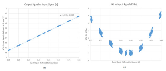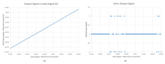 Short signal range demonstration. (a)—The absolute output signal (namely the equivalent analogue version of the digital output), as a function of the input voltage level; (b)—The absolute ADC differential non-linearity (DNL), as a function of the input voltage level.
