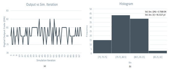 Thus far, the enhanced thin-oxide design ADC input-to-output response characteristics, namely the INL and the DNL, have been addressed above, which presents similar ADC INL and DNL features compared with the legacy work [1]. The features must remain this way, as the most relevant pay-off effect comes with the next performance feature, namely the intrinsic converter noise performance. That being said, Figure 12a depicts the converter output codes and Figure 12b depicts the noise results (hence the resulting output codes dispersion) of an extensive and time-consuming Transient-Noise simulation, under a DCDS operation, with a static DC input signal, equivalent to low-light input signal scenario and with the ADC subjected to 5 mVrms noise on the power supply node, plus an additional uncorrelated 5 mVrms noise applied on the ground. It is necessary to subject the modulator circuits operation to a more realistic on-chip power supply environment, such as in this case, rather than using the traditional clean power supplies tests, which is not a realistic case in the slightest.