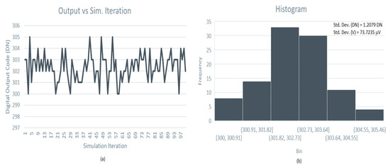 Transistor level Transient-Noise simulation with ADC output noise measurement under Digital CDS operation. (a)—ADC output digital codes as a function of the simulation run (equivalently the noise performance in the dark); (b)—the corresponding digital output codes occurrence frequency through a histogram.