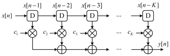 The FIR filter is one of the most commonly used digital filters in digital signal processing systems. In general, the output signal of a K-tap FIR filter can be calculated in the time domain as (1), where is the input discrete-time signal, is the filter coefficient, and K is the tap of the FIR filter.