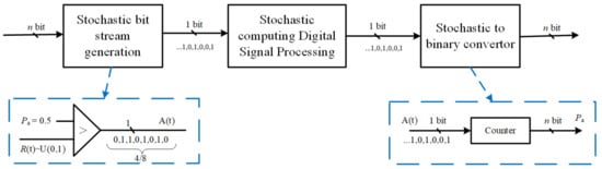Stochastic computing is a low complexity algorithm design and hardware implementation technique, where a numerical value a is represented with stochastic bit stream , . As a result, the complex operations in conventional TCS systems can be mapped into quite simple logic operations. A typical stochastic computing-based DSP system is illustrated in Figure 2.