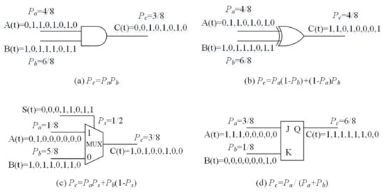 The stochastic computing-based logic circuits could significantly reduce the hardware cost and critical path delay compared with conventional TCS circuits, illustrated as Figure 3a, where the multiplication is implemented by a single “AND” logic [16]. As shown in Figure 3b, a simple “XOR” logic is used to perform calculation. The scaled addition can be realized by a multiplexer logic shown as Figure 3c, and the sum is scaled according to . Except for the linear computation, addition and multiplication, the division can be implemented by a J-K Flip-Flop illustrated as Figure 3d. The backward-transformed numerical value is shown as “Stochastic to binary convertor” in Figure 2.