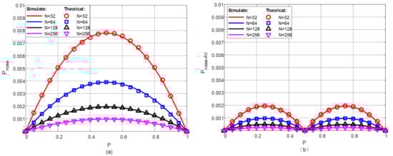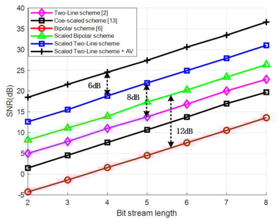 Furthermore, the signal-noise ratio (SNR) can be calculated as (6), where the signal power . It can be observed that the SNR would be affected by the numerical value P. Thus, it would be possible to increase the SNR by scaling the numerical value. In other words, when P is scaled up, the SNR would be increased even with the same bit stream length.