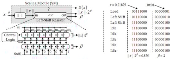 Applying the proposed ASA to the SFIR filter would be helpful to improve calculation accuracy and SNR of the output signal. The hardware architecture of the scaling module (SM) is illustrated in Figure 6, which corresponds to “Find scaling factor” and “Scaling” step in Algorithm 1. The scaling factor is easy to find using the left-shift registers. As a general example, consider a input value , whose sign bit “ is extracted firstly. The magnitude value in binary format “b’” and initial scaling factor value in binary format “b’” are loaded in the left-shift registers. Afterward, all of the registers begin to left-shift until the first “1” occurs at the most significant bit (MSB), and the rest cycles are in an idle state. Note that the total number of left-shift cycles equals the date width of . Finally, the scaled value “b’” and scaling factor are output.