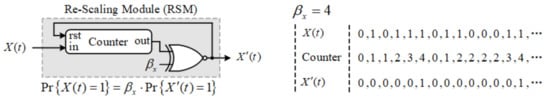 Afterward, the counter is compared with scaling factor with “XNOR” logic. The output re-scaled bit stream can be represented as (18).