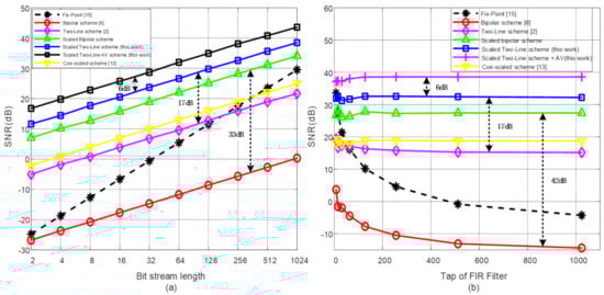 Afterward, the ASA based SFIR filter with 48-tap under different bit stream length was simulated, and the results are shown in Figure 11a. The SNR performance gains on the bipolar scheme and two-line scheme are 33 dB and 17 dB, respectively. Furthermore, the ASA-AV-based SFIR filter gained 6 dB on SNR performance compared with the ASA-based scheme. The fix-point TCS-based scheme is also presented in Figure 11 as a comparison, which is optimized using state variable analysis method [18].