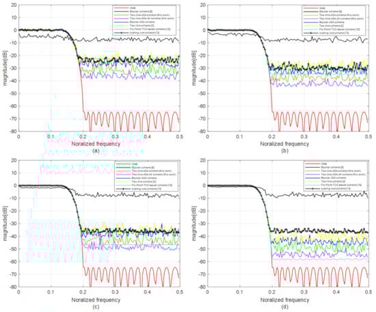 Magnitude responses of 47th-order SFIR filters: (a) (Fix-Point 8 bits), (b) (Fix-Point 10 bits), (c) (Fix-Point 12 bits), and (d) (Fix-Point 14 bits).
