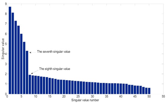 The matrix K is obtained from the driving data of ET in Section 6.1. The grid heat matrix F is constructed based on the experimental data, and, then, the matrix element value is the number of times the ET passes through a grid. The ET trajectory data are sparse; thus, matrix F is a highly sparse matrix. The sparse random projection transform is used to reduce the dimension of matrix F, and the time of singular value decomposition is 25.3 s. Figure 2 is a curve of the singular value. From the trend of the singular value change in Figure 2, it can be concluded that after the seventh, the range of the singular value change decreases obviously and tends to be stable. Therefore, this paper sets the dimension of semantic subspace to 7 and carries out a similarity analysis between the Laplace maps to achieve semantic spectral clustering.