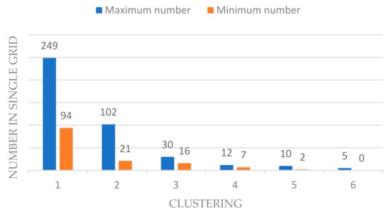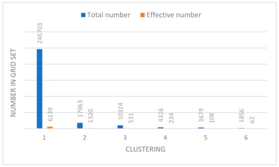 The calculation process is described as follows: after obtaining the grid heat matrix F and the “grid-ET” matrix K, calculate the semantic similarity of any grid with Formula (9); then, obtain the semantic distance matrix and similarity matrix shown in Formula (11) and Formula (12), respectively; further, calculate the Laplace matrix J with Formula (13); and, finally, conduct the similarity analysis between the Laplace maps. Through the k-means clustering algorithm, the semantic spectrum clustering is realized. According to the clustering results, the urban grid is divided into different categories; that is, the urban planning spatial areas are divided into different clusters. Figure 3 shows the number of times ETs pass through all grid sets in different clusters. Figure 4 shows the number of ET passes in a single grid in different clusters. Table 2 shows the actual physical meaning of the planning space corresponding to different clusters. Among them, station includes bus stations and railway stations. The market shopping center includes commodity centralized circulation places, supermarkets, large markets, etc.