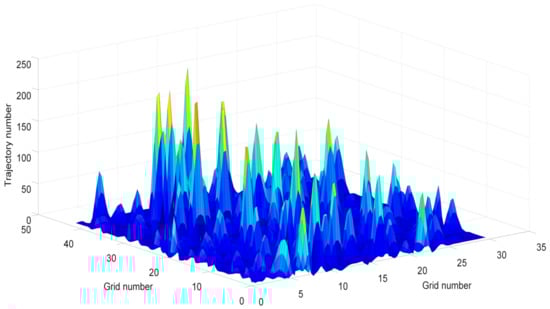 Assuming that there are n ETs, each ET is a column of the matrix; the number of grids in the planning space is m; and each grid is a row of the matrix, which constitutes a “grid ET” matrix K of order m rows and n columns. In matrix K, according to the different assignments of matrix elements k(i, j) and their physical meanings, the traffic trajectory can be mined in different aspects. Matrix K is represented as follows: