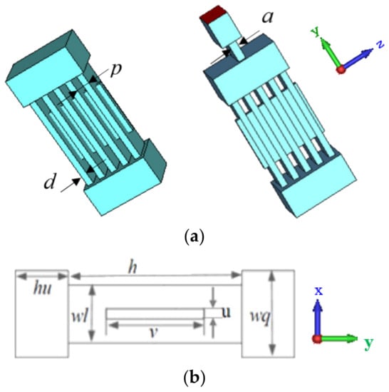 In this paper, a high-order mode coupled cavity with periodic arrangement gaps is designed. The 3D model of the idler cavity and output cavity are shown in Figure 1a using the scheme of a sheet beam (aspect ratio is 10). Figure 1b shows the cross-sections in the xy plane, where the period between the gaps is p, the length of the gap in x direction is d in the z-axis, the width and height of the gap are wl and h, respectively, the width and height of the beam tunnel are v and u, respectively, and the width and height of the coupling cavities are wq and hu, respectively.