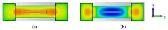We chose TM31 mode as the operating mode, which can be compared with the traditional scheme of the fundamental mode TM11 in Figure 2. On the one hand, the electric field of TM11 mode is stronger near the upper and lower coupling cavity, and the electric field at the center gap is a little weaker, as shown in Figure 2a, which was not suitable for the sheet beam we used. In addition, with the same dimension of the TM31 mode cavity working at 220 GHz, the resonance frequency of the TM11 mode is about one third, which is far away from the G-band. However, the electric field of the TM31 mode is mainly distributed in the middle, and the electric field is stronger, as shown in Figure 2b. Therefore, the TM31 mode is more beneficial for sheet beam interaction. On the other hand, the dimensions of the structure designed using TM31 mode are larger, which makes it less difficult to fabricate later.