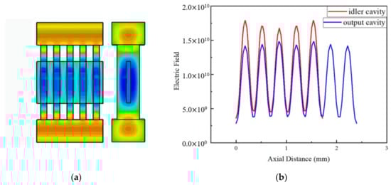 Through a large amount of simulation, the optimized geometry parameters of the idler cavity with five gaps are given in Table 1, which corresponds with Figure 1. Then, the electric field distribution of the five-gap idler cavity is shown in Figure 3. As can be seen from the Figure 3a, the phase difference between the adjacent gaps is 2π, and the electric field distribution accords with the TM31 mode. Additionally, the electric field distribution is mainly concentrated in the upper and lower coupling cavities and the middle of the gap. The electron channel is located in the region of a strong electric field in the middle of the gap, which enhances the beam–wave interaction.