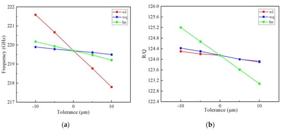 Influence of the fabrication tolerance of Δwq, Δwl and Δhu on the high frequency characteristics: (a) sensitivity of frequency and (b) sensitivity of R/Q.