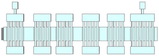 Following the multi-gap cavity optimization, the beam–wave interaction system of the EIK should be analyzed thoroughly. Figure 5 shows the complete beam–wave interaction model of a six-cavity EIK we designed with CST three-dimensional software, the input cavity and the idler cavity adopted five gaps, and the output cavity adopted seven gaps. We studied the length of the drift tube between each cavity and determined the appropriate values with more analysis. In order to extend the bandwidth for our multi-gap and multi-cavity EIK, the traditional stagger tuning method was adopted in our simulation, which has been widely used for the design of a multi-cavity klystron [,,]. The high-frequency characteristic parameters of each cavity were optimized, and they are listed in Table 3. By adjusting the value of wq, the resonant frequency of the idler cavity could be changed a little for the stagger tuning requirements, and then the best matching value of each cavity could be optimized for the beam–wave interaction analysis for our EIK.