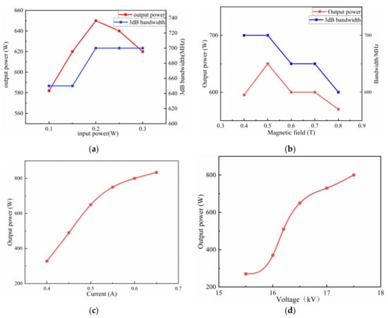 The variation of the output power and bandwidth with typical parameters. (a) The output power and 3-dB bandwidth variation with the input power, where the current (0.5 A), voltage (16.5 kV) and magnetic field (0.5 T) remain unchanged. (b) The output power and 3-dB bandwidth variation with the magnetic field, where the current (0.5 A), voltage (16.5 kV) and input power (0.2 W) remain unchanged. (c) The output power variation with the current, where the voltage (16.5 kV), magnetic field (0.5 T) and input power (0.2 W) remain unchanged. (d) The output power variation with the voltage, where the current (0.5 A), input power (0.2 W) and magnetic field (0.5 T) remain unchanged.