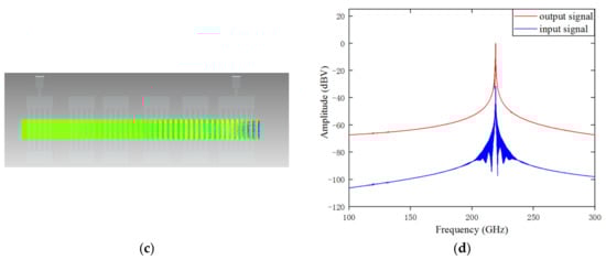 After the above optimization, the structure parameters and output characteristics of the EIK were determined thoroughly. As for the results, Figure 7a shows the peak output signal at a resonant frequency of 218.9 GHz, voltage of 16.5 kV, current of 0.5 A and magnetic field of 0.5 T. It can be seen from the figure that at the beginning, the output signal gradually increased, and it soon reached the maximum value at 2.5 ns and then remained stable later. Figure 7b shows the phase space portrait of the electron energy along with the axial distance. It can be seen that in the first few cavities, due to the weak modulation effect, the energy of the electron beam changed little and fluctuated around 16 KeV, while with the enhancement of the modulation effect of the latter several cavities, the energy conversion gradually increased, and when it came to the output cavity, most electrons decelerated while a few electrons accelerated. Thus, much of the energy of the electrons would be released effectively. Figure 7c shows the bunching of the electron beam. It can be seen that the bunching effect of the electron beam from the input cavity to the output cavity was gradually enhanced, reaching its maximum in the output cavity, indicating that the electron beam had good interaction with the electromagnetic wave. Figure 7d is the frequency spectrum of the input and output signals, which shows that the amplified signal only had a peak value at 218.9 GHz, which was the same as the input frequency. In addition, the peak value of the output signal was 35 dB higher than the input signal. This shows that there was not any mode competition in the structure, and the input signal was amplified well.