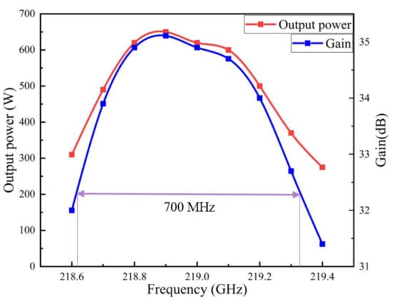 Figure 8 shows the relationship between the output power and frequency for our designed EIK. Under the conditions of a voltage of 16.5 kV, current of 0.5 A, focus magnetic field of 0.5 T and input current of 0.2 W, the maximum output power could reach 650 W at the frequency of 218.9 GHz. If the resonance frequency was increased or decreased, the output power would decrease gradually. Thus, the 3-dB bandwidth of 700 MHz could be achieved successfully, which was very high for a high-order mode and sheet beam EIK. Additionally, the RF efficiency of our EIK was 7.9%, and when the input power was zero, the output power of the EIK was very small, being almost zero, which shows that our structures had good suppression of self-excited oscillation, which undoubtedly made our G-band EIK have stable output performance for the beam–wave interaction and reliable output performance.