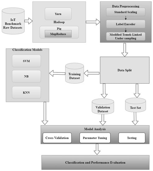 The proposed model is developed in two phases as represented in Figure 4. A multi-level architecture is implemented in the proposed model. In the initial stage, the benchmarks IoT datasets are uploaded into the HDFS. Yarn, which is the resource manager of Hadoop manages the name node, data node and secondary name node of the cluster. The pig script is then executed in the Map Reduce node to implement the Map Reduce functionality. The processed data is saved in the HDFS for further analysis. In the next level, a data pre-processing is performed by standard scaling, label encoder, and under-sampling of majority labeled samples. In the under-sampling technique, the samples with majority class records concerning noise, contribution factor, and redundancy is performed. The final stage is the prediction of the IoT network traffic by deploying three classifiers KNN, SVM, and NB to predict the class labels. This approach improves the accuracy and minimizes the false alarm rate. A hyperparameter optimization is performed using artificial immune network. The desired accuracy is obtained in minimal amount of time because the datasets are processed in Hadoop environment which is discussed in the experimental section. The parameters of SVM, KNN, and naïve Bayes are tuned for optimal accuracy as shown in Table 2 and Table 3. The pseudocode of the various classifier predictions given in Appendix A.