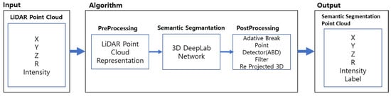 The purpose of this study was to conduct a semantic segmentation of LiDAR data that can be used in perception systems of autonomous vehicles. The method for projecting LiDAR data into a 2D image coordinate system, and the configuration and characteristics of a DNN for a semantic segmentation of the projected image, are described in this section. Postprocessing using ABD was used to limit the misclassification during the process of recovering from the inferred image using LiDAR data. After projecting from (A) the input to the 2D image coordinate system, the semantic segmented LiDAR data were output by passing through (B) the proposed DNN and (C) the ABD filter, as shown in Figure 1.