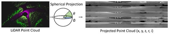 where denote the width and height of the image, and denote LiDAR data. Here, is the field of view of the sensor, and [12]. The image is generated by projecting the LiDAR data and onto the converted coordinate system using Equation (1). The created image is input into the network in the form of . A spherical projection is shown in Figure 2.