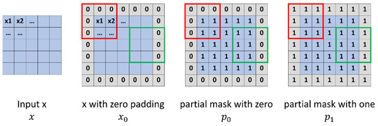 A partial convolution is a padding method proposed by Nvidia. The size of the input data decreases as the convolution and pooling proceed. The data may be excessively reduced, and information may be lost as the depth of the network increases. Padding is applied to extend the surroundings of the input data by filling them with a specific value to prevent data loss. Generally, zero padding is used. However, data including errors are obtained at the border of the image if it is filled with a specific value or zero. Partial convolution is a method of conditioning the output for input data by defining 0 as a hole and 1 as a non-hole by adding a binary mask. A partial convolution is helpful for data loss through the abovementioned method and has been applied to holes generated when the LiDAR data and the error at the border are projected onto a 2D coordinate system [13]. The partial convolution is shown in Figure 3.