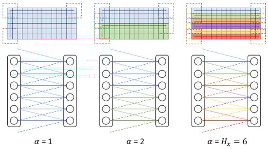 A semilocal convolution uses the fact that data in a fixed space are measured when LiDAR data are projected into a 2D coordinate system, unlike the image data of a camera. This convolution is applied by dividing the input data by . Different kernels can be applied to the segmented convolution, and the convolution weight divided by the region is shared. Moreover, it can be learned by using the characteristics of LiDAR data because it is learned by dividing the input data by region and applying weights [14]. The semilocal convolution is shown in Figure 4.