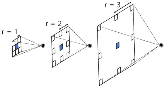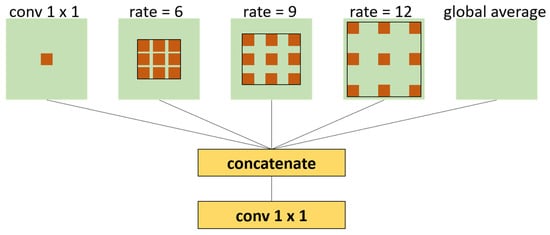 Atrous convolution creates and uses an empty space inside the kernel, unlike a conventional convolution. For segmentation, it is better for a DNN when a pixel has a wider field of view. A conventional method constructs a deeper DNN for the pixel to have a wider field of view. However, more original information is lost when the DNN is deeper. An atrous convolution expands the field of view of a pixel by creating an empty space. This is advantageous for segmentation, and a light DNN can be configured because the field of view of a pixel is expanded. Here, r represents the size of the empty space. Different ratios of r can be used to obtain multiscale features simultaneously [15]. An atrous convolution is shown in Figure 5. This convolution is used in a network, as shown in Figure 6.