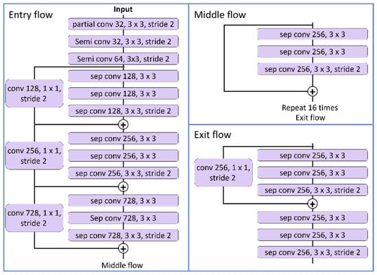 This loss function is applied most frequently. Here, denotes the ground-truth for class c at the one-hot encoded pixel position i, and denotes the predicted data of softmax. Generally, semantic segmentation is evaluated using the mean intersection over union (mIoU). The purpose is to minimize the cross entropy in the learning process to reach a high mIoU. The modified 3D model of Xception is shown in Figure 7. The network structure is shown in Figure 8.