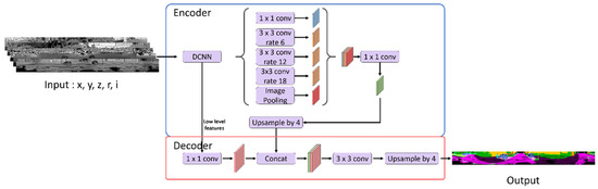 Data are received in the form of as input. An encoder–decoder structure is used with DeepLabV3+ as the backbone. Xception-41 is used as the backbone network, and the entry part is replaced with a partial convolution and semilocal convolution considering that the inputs are LiDAR data. Cross entropy is used as the loss function [14].