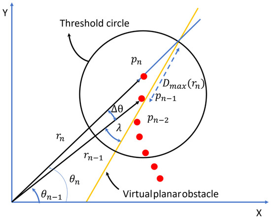 When the distance between is greater than the threshold circle (), ABD is a method that designates this as a break point [16]. If the threshold of the circle is small, the prediction will not be reached, and if it is large, an overflow will occur.