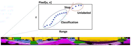 The pseudocode of the ABD, as shown in Table 1, adaptively depends on and r, as shown in Figure 9. Here, , denotes a user-definable constant, and is the sensor noise associated with r, in which the range of influence of the circle is wider when is small or is large. The distance r and height h of data projected on a pixel [u, v] were substituted into the filter by using the ABD as a filter in order of distance, and the classification result was applied by designating it as one object up to the break point. The parameter values were calculated empirically. In the system, is 10, and is 2. The ABD is shown in Figure 9. The ABD postprocessing is shown in Figure 10.