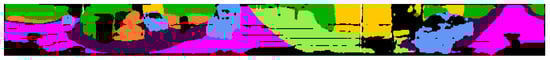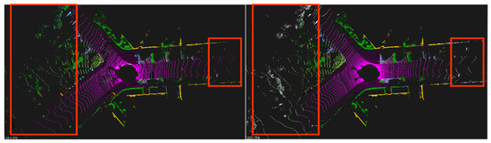 Here, ,, and are the true positive, false positive, and false negative predictions of class c, respectively, and C is the number of classes. For the evaluation network, the network was improved to apply DeepLab V3+, which is a 2D semantic segmentation network, to 3D LiDAR data as a backbone. An evaluation of the network inference results is shown in Table 4. It contains the results according to the image size and the size of the decoder stride of DeepLabV3+. The network results are shown in Figure 11.