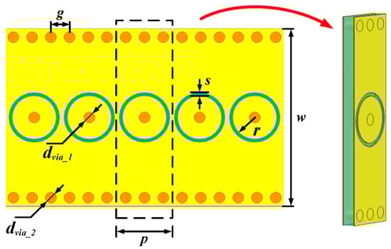 The proposed SSPP structure based on SIW is shown in Figure 1, where the metal film has a thickness of 0.035 mm and is denoted in yellow. It consists of a conventional SIW with the periodic array of ring slots on the top metal layer and via holes. The via hole connected to the ground of the bottom metal layer is located at the center of the ring slot for each SSPP unit cell. The dielectric substrate sandwiched between the top and bottom metal layers is F4B using PTFE material from Wangling, which has a relative dielectric constant of 2.65, loss tangent of 0.0015, and a thickness of 0.5 mm. To further understand the properties of the proposed SSPP structure, its dispersion curves are analyzed. The parameters of the SSPP unit cell are set as follows: w = 8.2 mm, p = 2.5 mm, g = 0.85 mm, r = 1 mm, s = 0.15 mm, dvia_1 = dvia_2 = 0.5 mm.