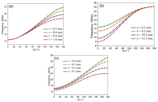 Dispersion curves of the proposed SSPP unit cell (a) with different r, (b) with different w, and (c) with different s.