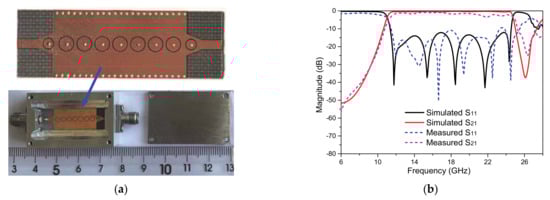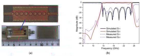 Figure 7a is the fabricated photograph and Figure 7b shows the comparisons between the simulation and measurement results, where they are in good agreement. It is observed that the left and right edges of the passband are at 11 GHz and 24.6 GHz, respectively, consistent with the cutoff frequencies in Figure 6. The center frequency of this BPF is at 17.8 GHz and the corresponding relative bandwidth is 76.4%, which is wider than that of the first filter example.
