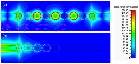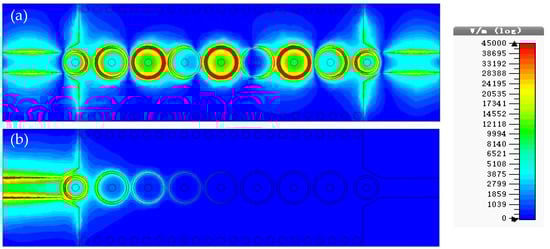 To validate the transmission characteristics of the proposed circuit, the electric field distributions at 20 GHz and 7 GHz are simulated by the commercial software CST Microwave Studio [] as shown in Figure 5a,b, which are located within the passband and at the out-of-band, respectively. The electromagnetic signals can efficiently propagate from microstrip line to the proposed SSPP waveguide at 20 GHz but are blocked quickly at the out-of-band, such as at 7 GHz.