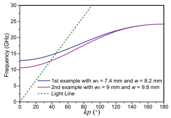 As mentioned above, the left and right edges of the BPF’s passband can be adjusted by the SIW and radius of the ring slot, respectively, thus the bandwidth and center frequency can be easily manipulated. Here, another SSPP unit cell example is designed with the lower cutoff frequency and asymptotic frequency at 11 GHz and 24.6 GHz, respectively. The parameters w3 = 9 mm and w = 9.8 mm are set different from those of the first filter example while the other dimensions are the same. Figure 6 illustrates the dispersion characteristic comparisons between the two examples, where the asymptotic frequencies are the same at 24.6 GHz since the cutoff frequency of the SSPP mode is not affected when the width of SIW wall is changed. For the lower cutoff frequency, it will be decreased from 13 GHz to 11 GHz, thus the bandwidth will be broadened accordingly. The dash line shown in Figure 6 is the dispersion curve of the light line for reference to the two examples.