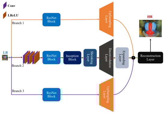 The overall network architecture is presented in Figure 1. Branch 1 (HR) and Branch 3 (HR) only used in the ResNet block with upsampling layer. Branch 2 (HR) used three basic CNN layers to extract the initial low-level features. The reconstructed basic low-level features are fed to the ResNet blocks followed by the Inception block. For upscaling purposes, the use of shrinking and expanding layer before and after the deconvolution layer to further reduce the number of model parameters. In our proposed architecture remove the batch normalization layer from the ResNet block to reduce the memory consumption of graphics processing unit (GPU), ReLU activation function is replaced with a leaky ReLU activation function to avoid the vanishing gradient problem and take out the max-pooling layer from the inception block for the best reconstruction of HR image. Resultantly output HR images of three branches are concatenate followed by a reconstruction layer to generate the HR output image.