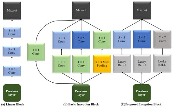 GoogLeNet was the winner of the 2014-ILSVRC competition and the main objective of this architecture was to achieve high accuracy with a reduced computational cost []. They introduced the new concept of inception block in CNN, whereby it incorporates multi-scale convolutional transformations using split, transform, and merge ideas. Additionally, it consists of different parallel convolutional branches with different sizes of the kernel which are then concatenated to increase the width of the network, finally fused the information, respectively.