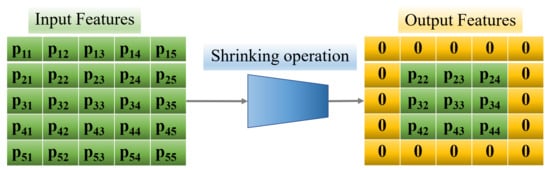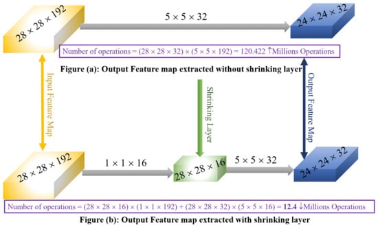 If a large number of feature maps are directly fed into the deconvolution layer, it will significantly increase the computational cost and size of the model. The computational complexity and model size can greatly be increased if a large number of feature maps are directly fed into the deconvolution layer. To maintain the model compactness and enhance computational efficiency, we used the bottleneck or shrinking layer, which is a convolution layer having a kernel size of the order 1 × 1 []. Figure 4 shows the basic operations of shrinking layer that reduces the dimension of the extracted feature maps. The input feature maps in Figure 4 is the order of 5 × 5 and the extracted new feature maps output are the order of 3 × 3, simply insert the zeros to the outside of the boundary. From the computational complexity point of view, we draw a two layers network one is without any shrinking layer and the other one is with a shrinking layer, as shown in Figure 5. The number of operations in Figure 5a is million operations, a very high figure as compared to Figure 5b which is million operations, due to the use of the shrinking layer.